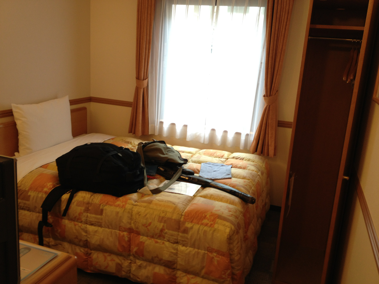 My small hotel room in Kyōto; note closet